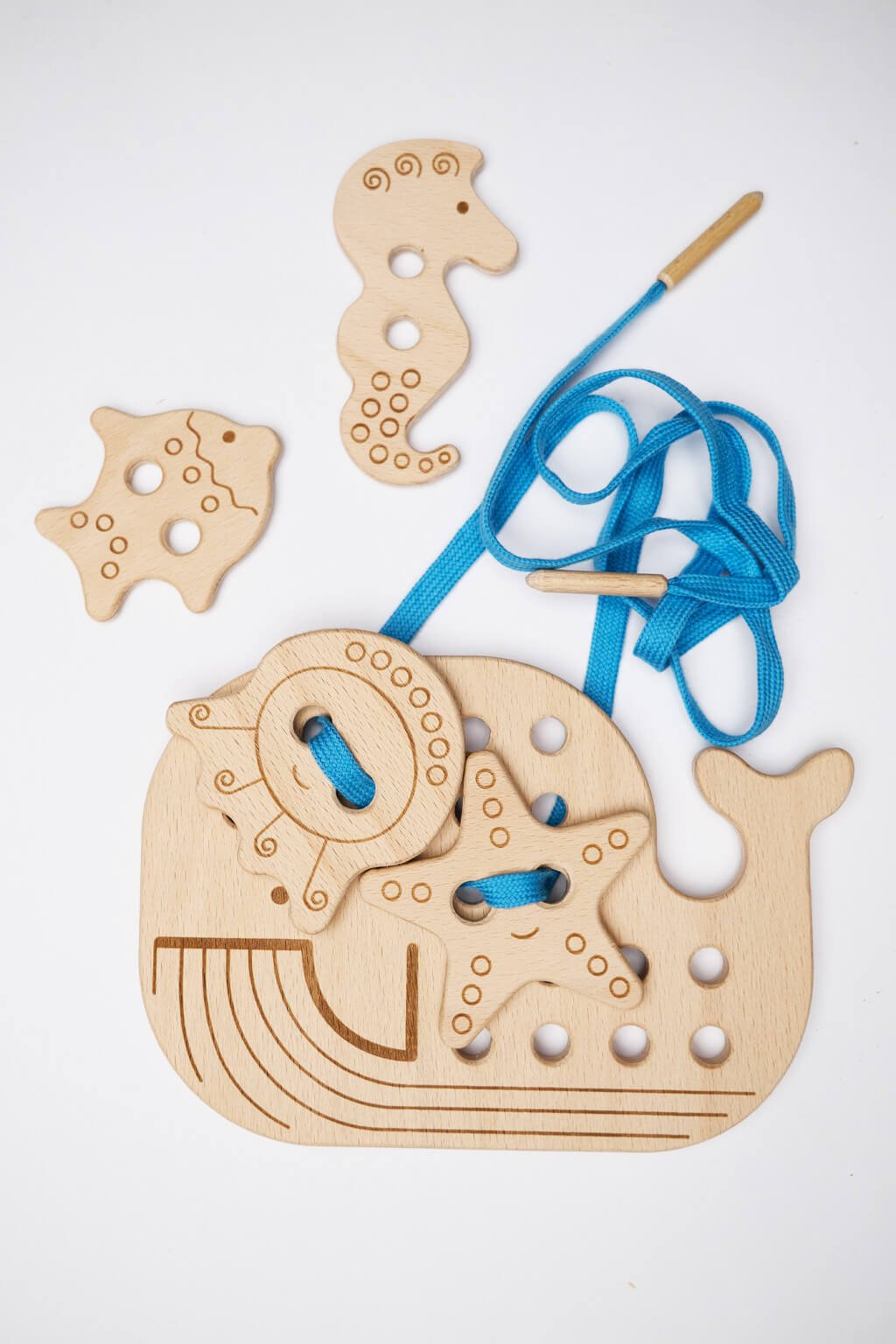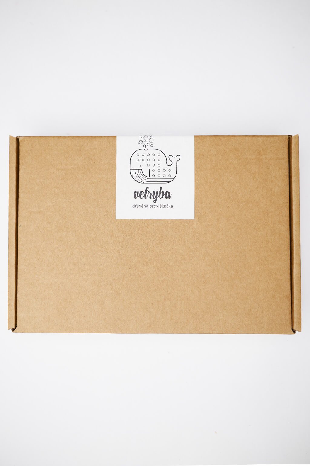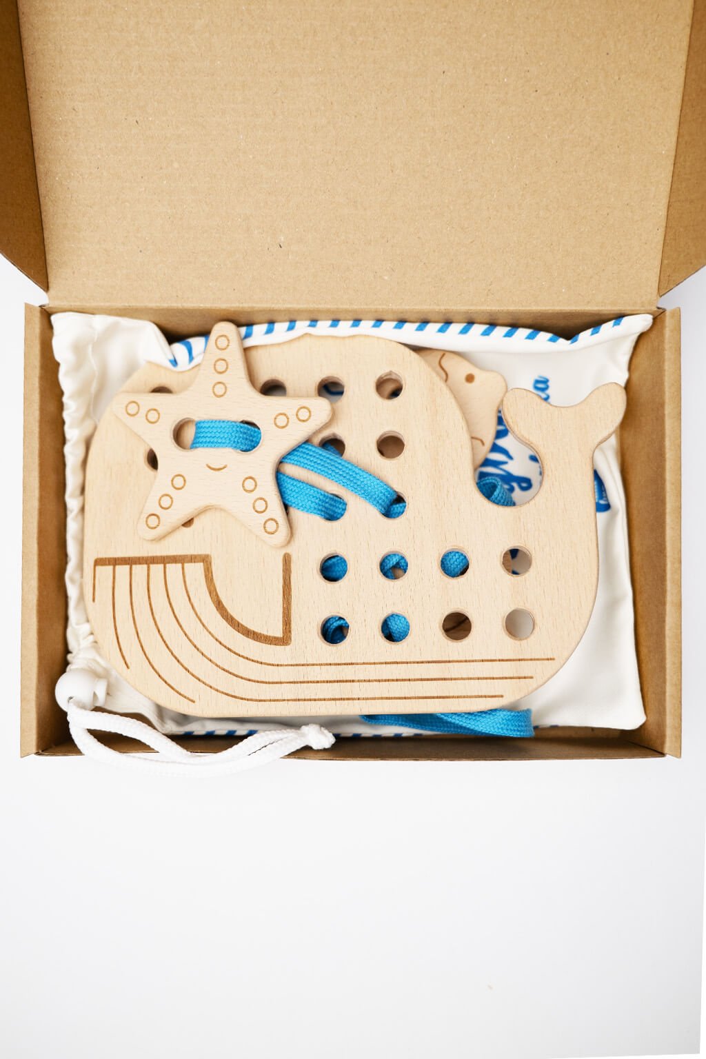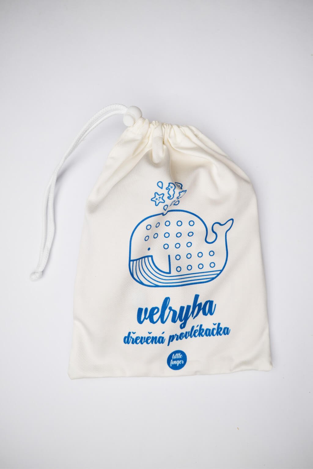 Dřevěná provlékačka ve tvaru velryby je didaktická pomůcka pro děti od 3 let, která podporuje jemnou motoriku a rozvoj řeči. Velryba (190 × 135 mm) má otvory o průměru 10 mm a doplněna je 120cm bavlněnou tkaničkou. Součástí balení jsou i čtyři provlékací mořští živočichové, bavlněný pytlík (18 × 20 cm) a dárková kartonová krabička.