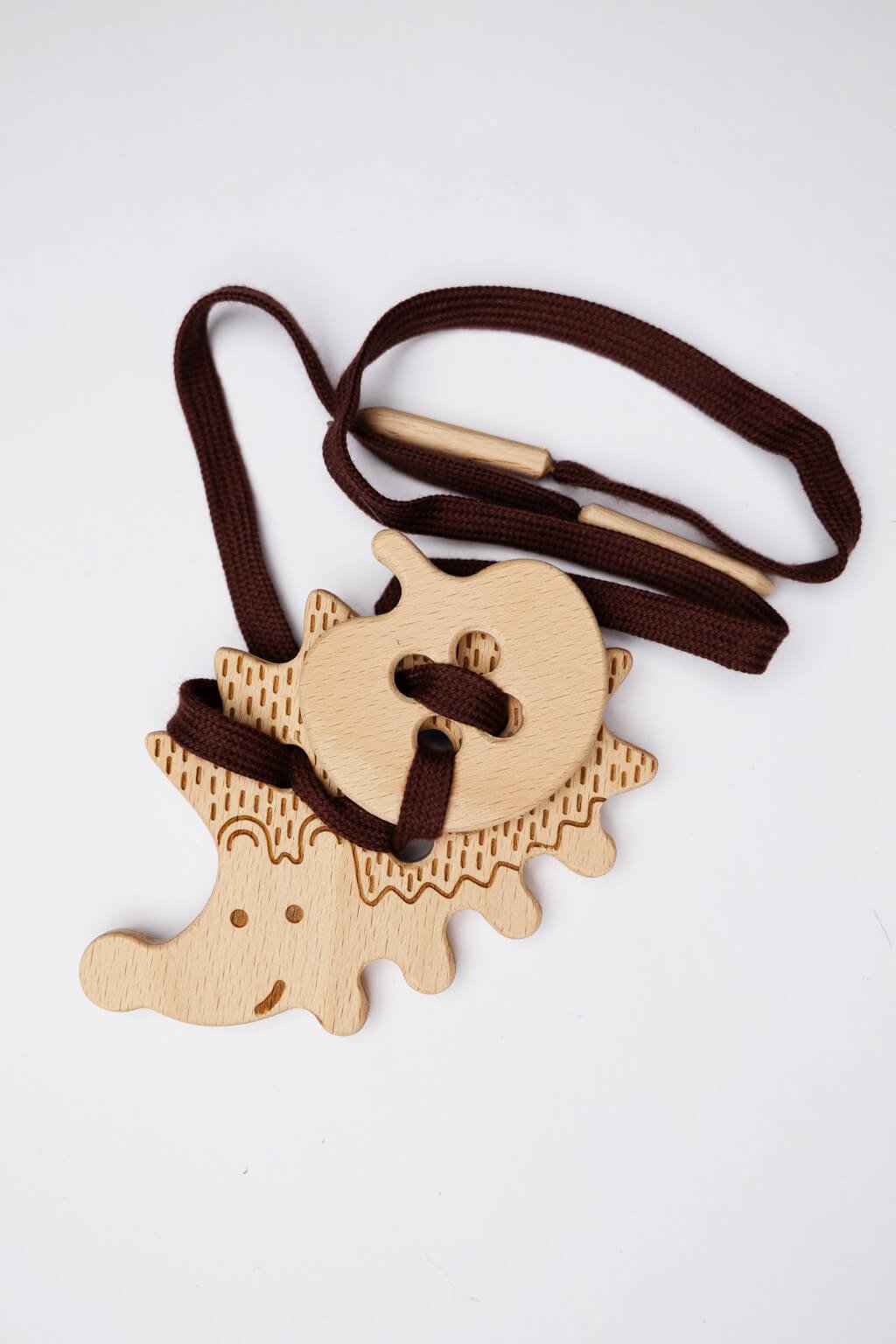 Dřevěná provlékačka je hravá pomůcka pro děti od 3 let, která podporuje jemnou motoriku a rozvoj řeči. Vyrobená je z kvalitní bukové překližky české výroby a doplněná o bavlněnou tkaničku (80 cm). Součástí balení je ježek (120 × 77 mm) a jablko (57 × 57 mm), vše uložené v dárkové kartonové krabičce.