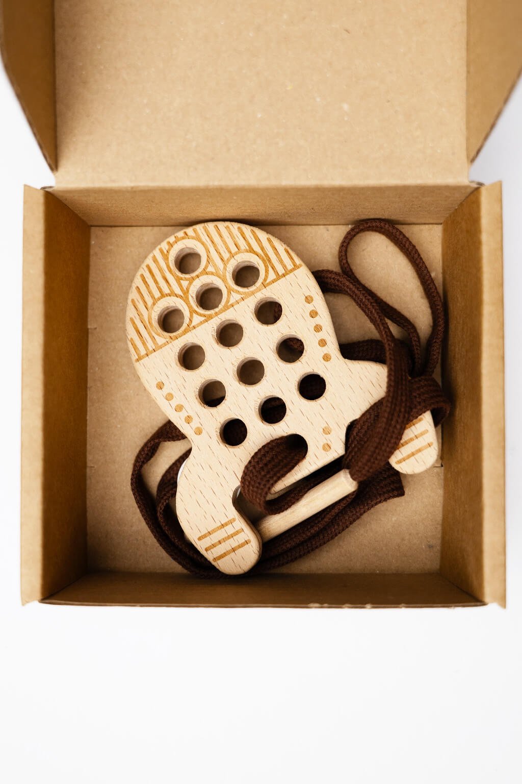 Dřevěná provlékačka je pomůcka pro děti od 3 let, která rozvíjí jemnou motoriku a podporuje rozvoj řeči. Vyrobena je z bukové překližky české výroby (8 mm), s rozměry 75 × 90 mm. Součástí je bavlněná tkanička délky 80 cm. Baleno v hnědé dárkové krabičce.