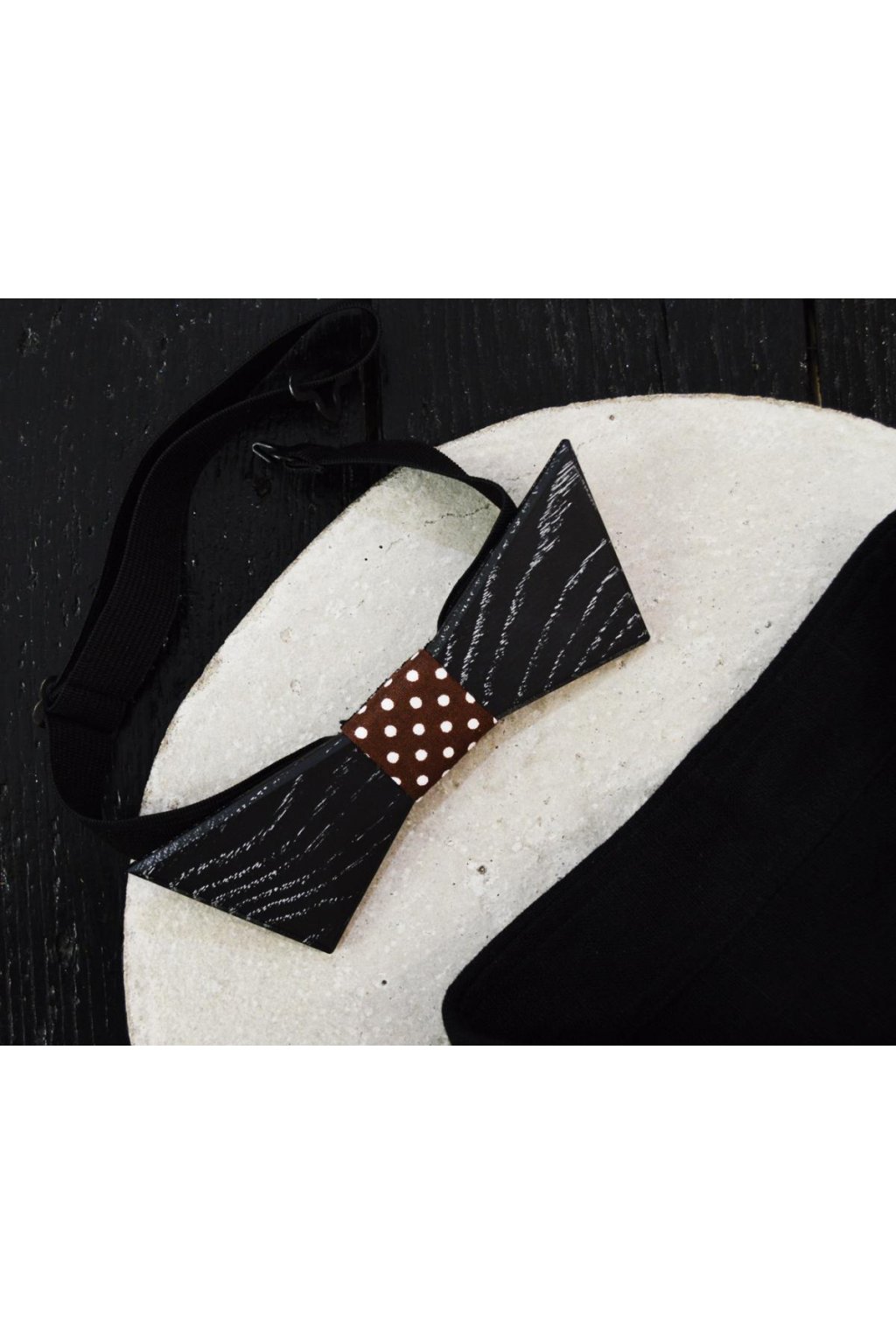Dřevěný motýlek | Černý, žíhaný s hnědým vázáním a bílými puntíky