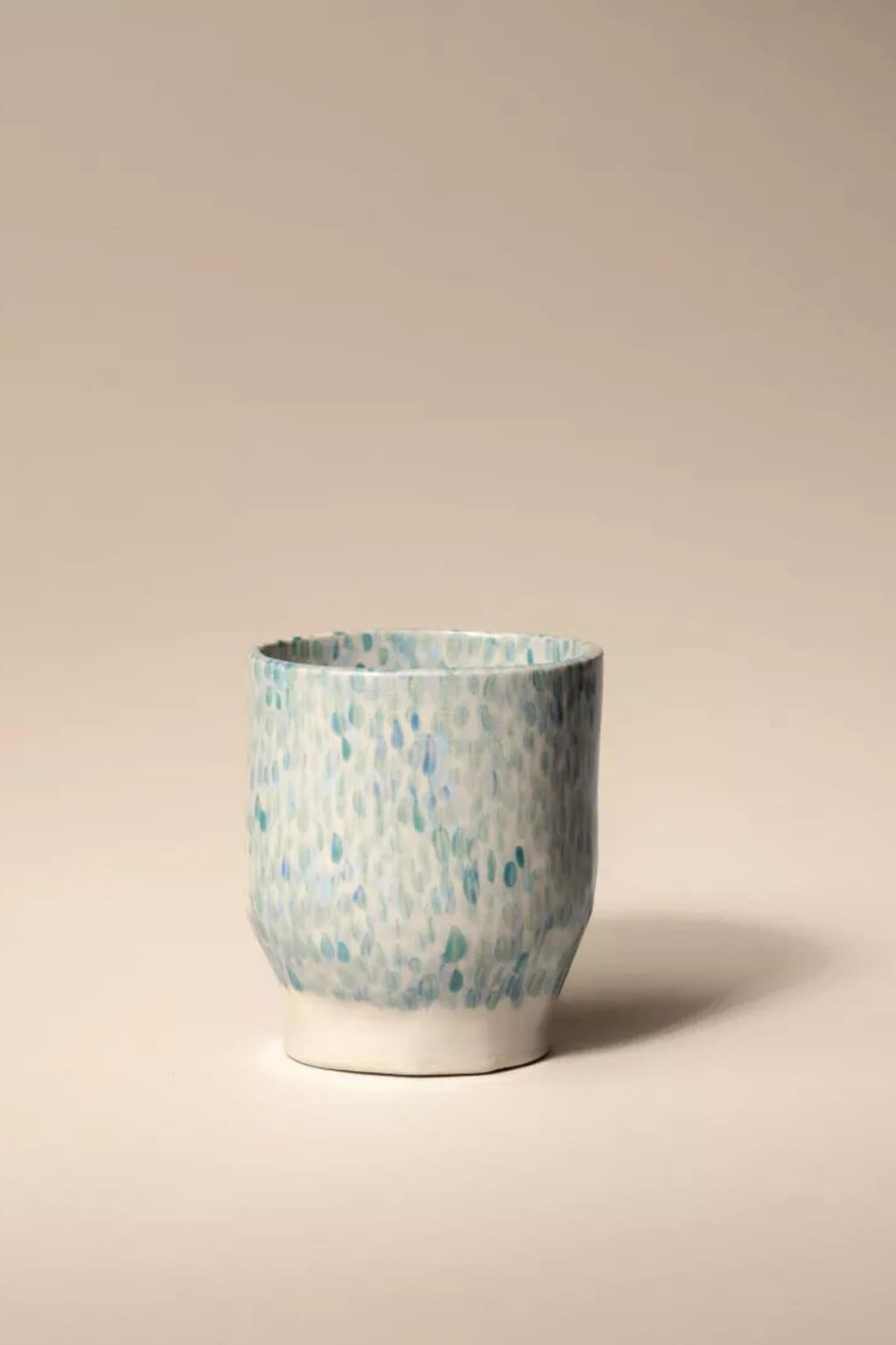 Hrníček je bez ucha, skvěle padne do ruky a příjemně zahřeje. Je pokreslen underglaze pastelkami v barvách: Turquoise, Orange, Lime, Violet