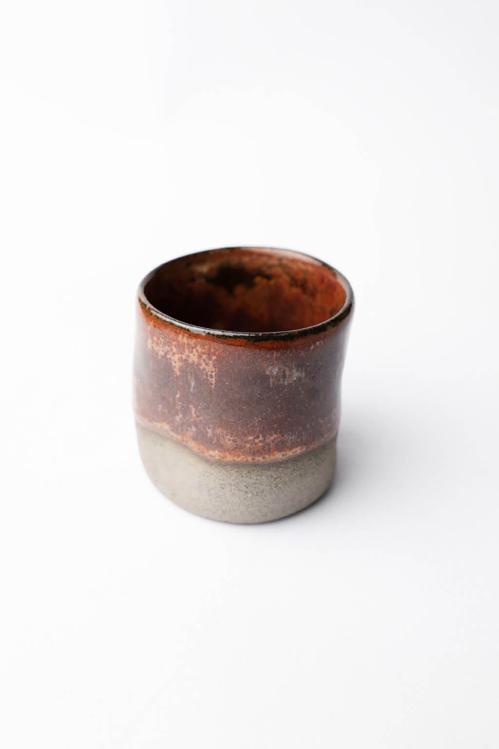 Kropenatý kalíšek zaujme svým promáčklým tvarem, který dokonale padne do ruky. Jeho povrch zdobí jemně stékající glazura, která krásně kontrastující s přírodním hliněným základem. Jednoduchý, ale výrazný design pro radost z každého doušku.