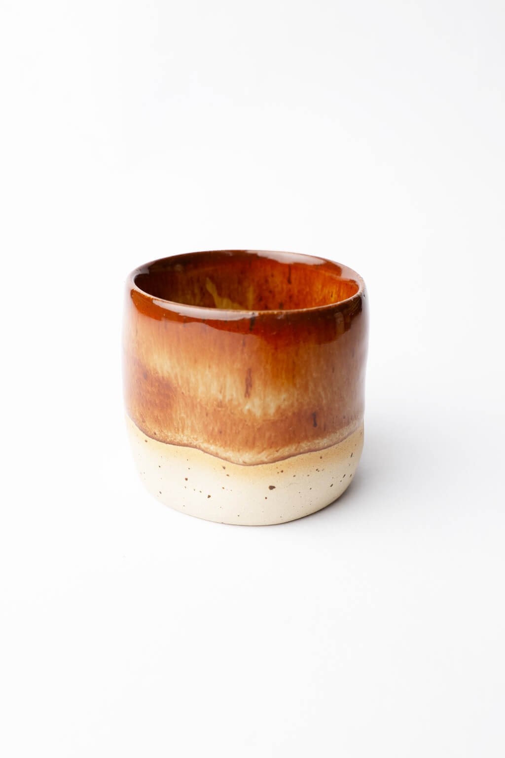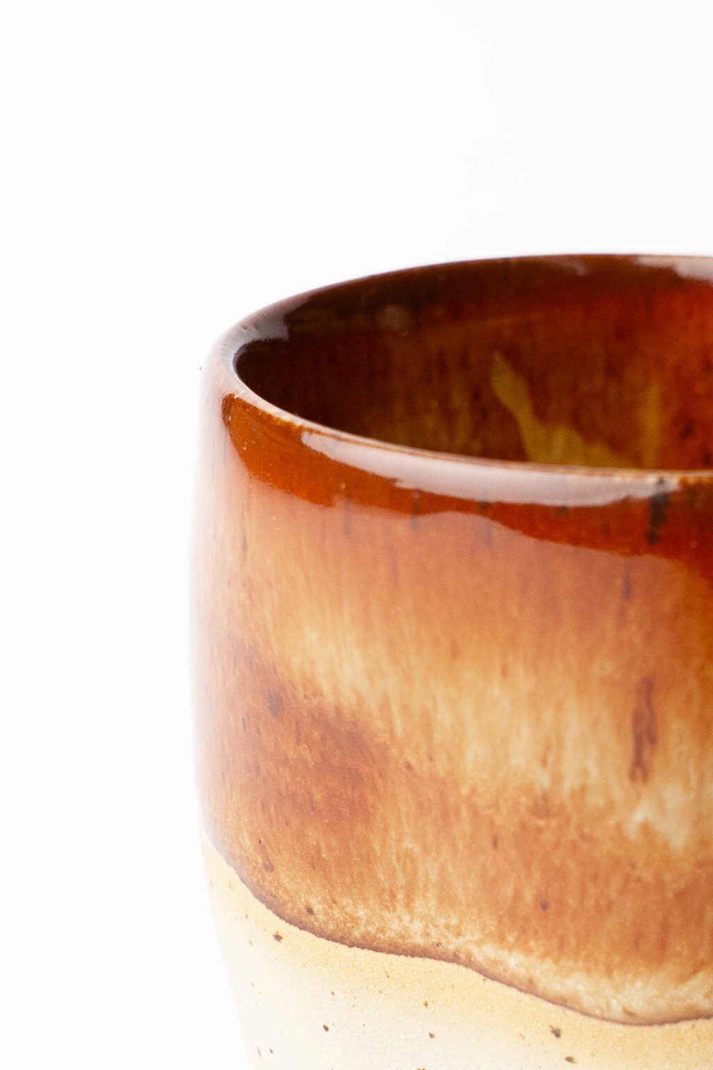 Kropenatý kalíšek zaujme svým promáčklým tvarem, který dokonale padne do ruky. Jeho povrch zdobí jemně stékající glazura, která krásně kontrastující s přírodním hliněným základem. Jednoduchý, ale výrazný design pro radost z každého doušku.
