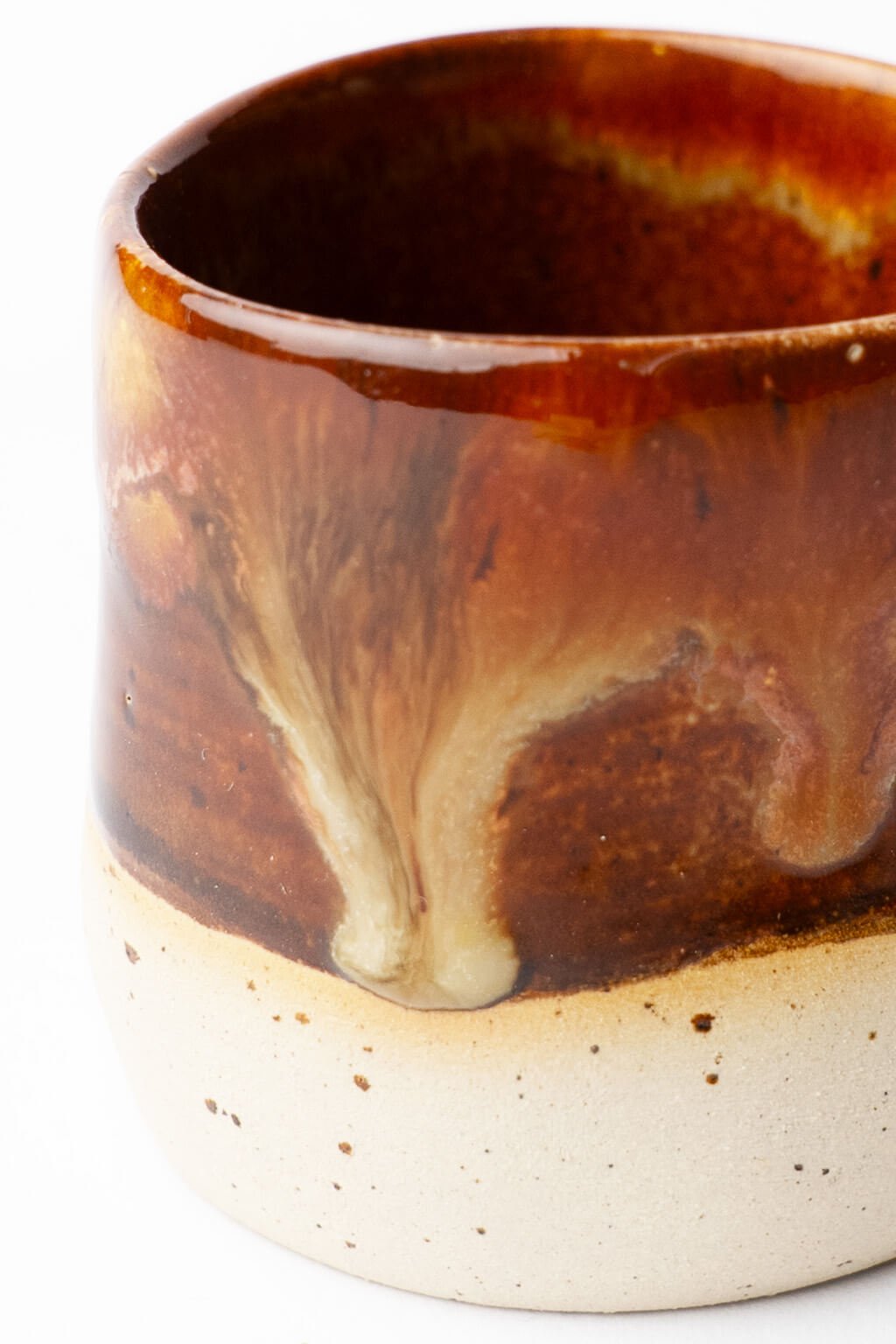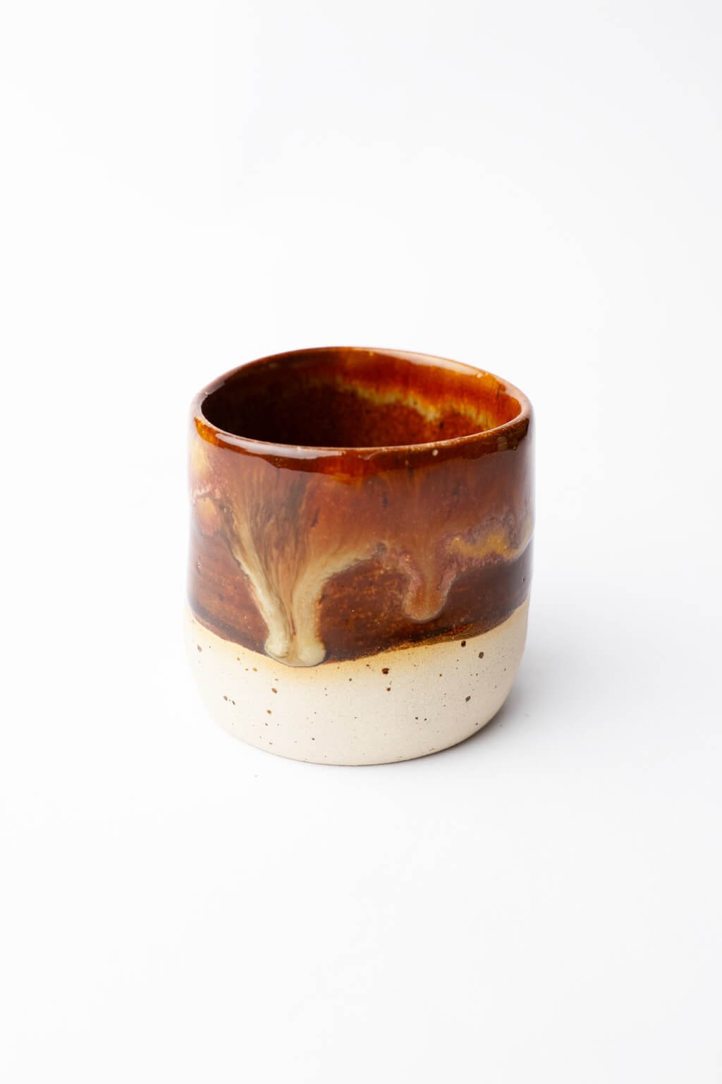 Kropenatý kalíšek zaujme svým promáčklým tvarem, který dokonale padne do ruky. Jeho povrch zdobí jemně stékající glazura, která krásně kontrastující s přírodním hliněným základem. Jednoduchý, ale výrazný design pro radost z každého doušku.
