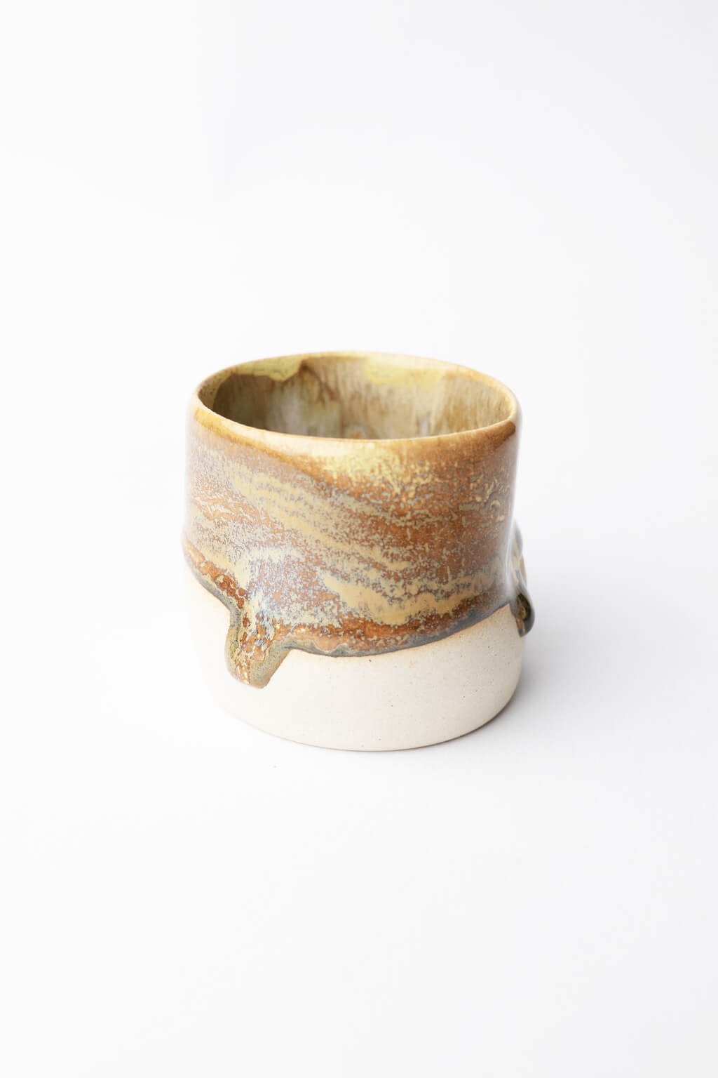 Kropenatý kalíšek zaujme svým promáčklým tvarem, který dokonale padne do ruky. Jeho povrch zdobí jemně stékající glazura, která krásně kontrastující s přírodním hliněným základem. Jednoduchý, ale výrazný design pro radost z každého doušku.