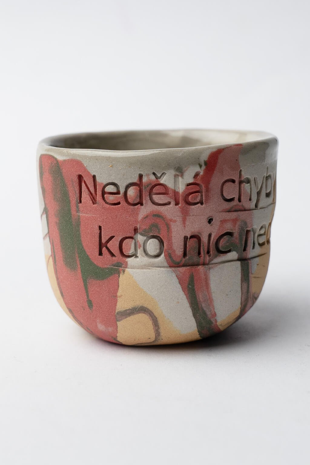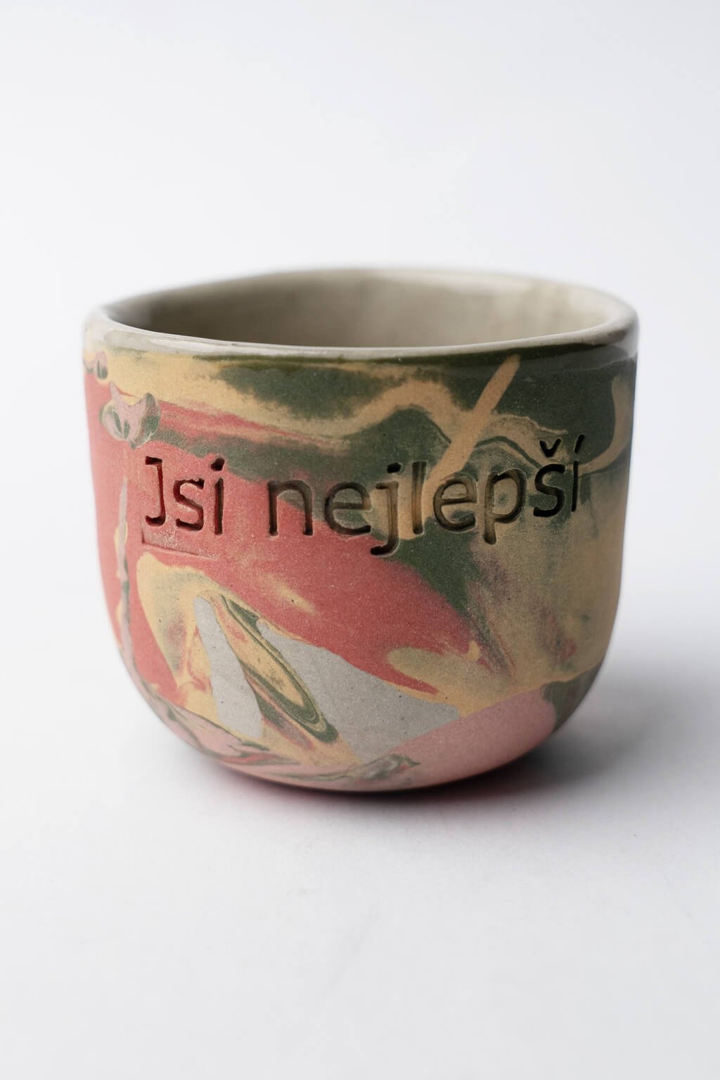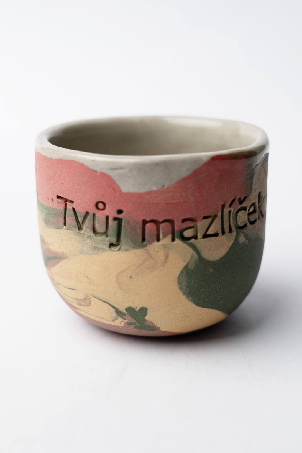 Keramický kelímek na espresso s barevnou cákanou glazurou s nápisy zaujme svou hravostí.