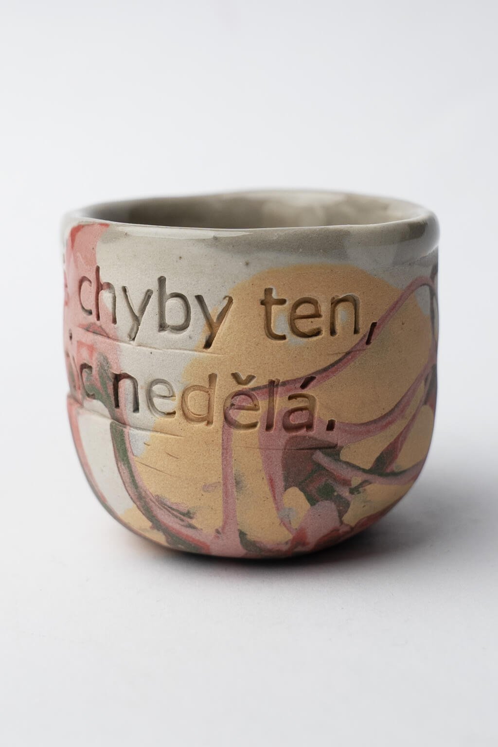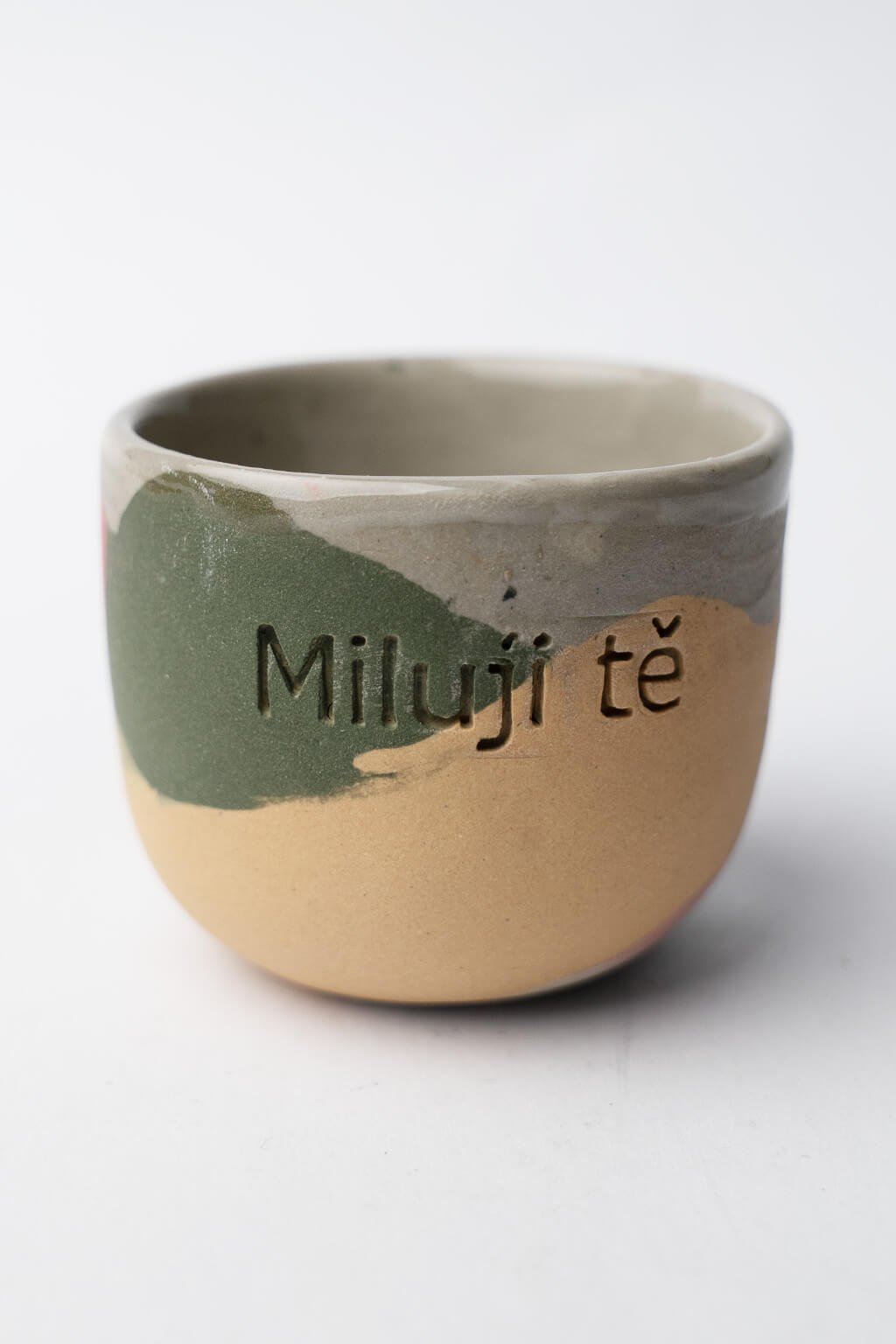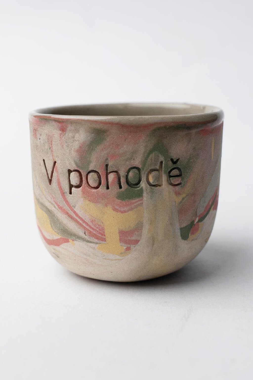 Keramický kelímek na espresso s barevnou cákanou glazurou s nápisy zaujme svou hravostí.