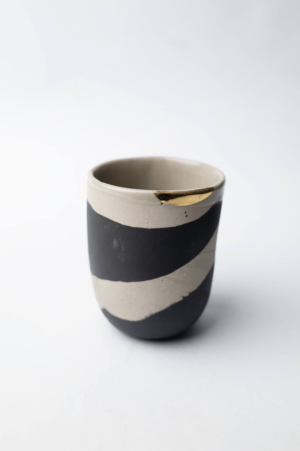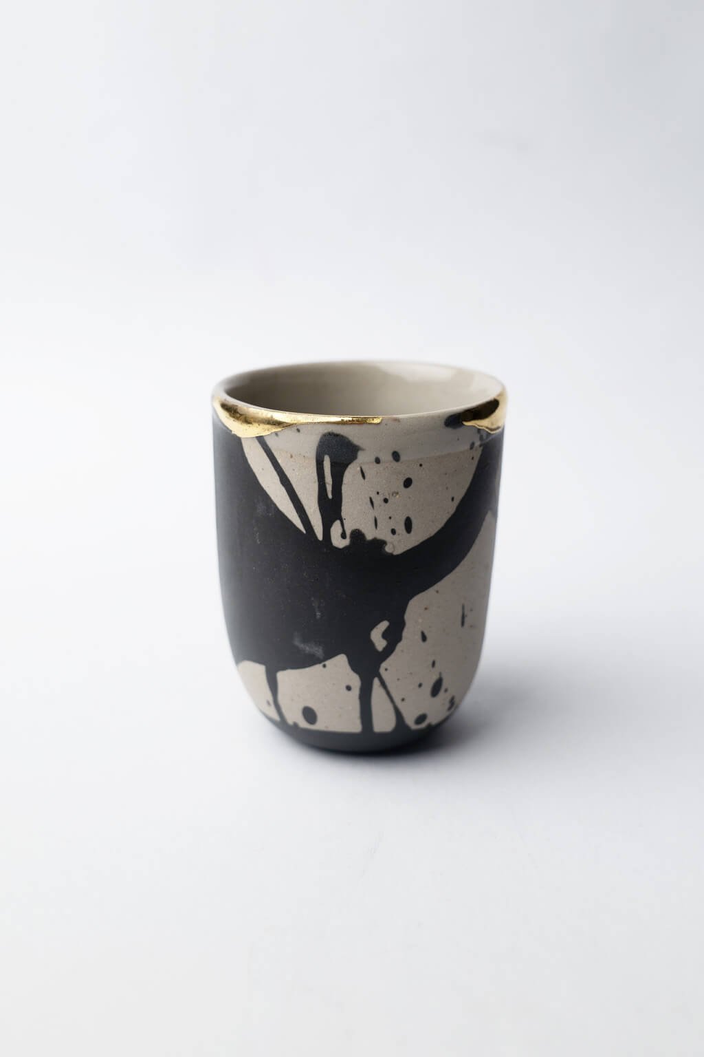 Keramický kelímek o objemu 200 ml s hladkým povrchem a matnou glazurou šedo-černé barvy je dokonalým spojením elegance a přírodního šarmu. Zlatá linka na okraji dodává kelímku nádech luxusu a zjemňuje celkový vzhled, čímž se stává skvostným doplňkem pro každý stůl.