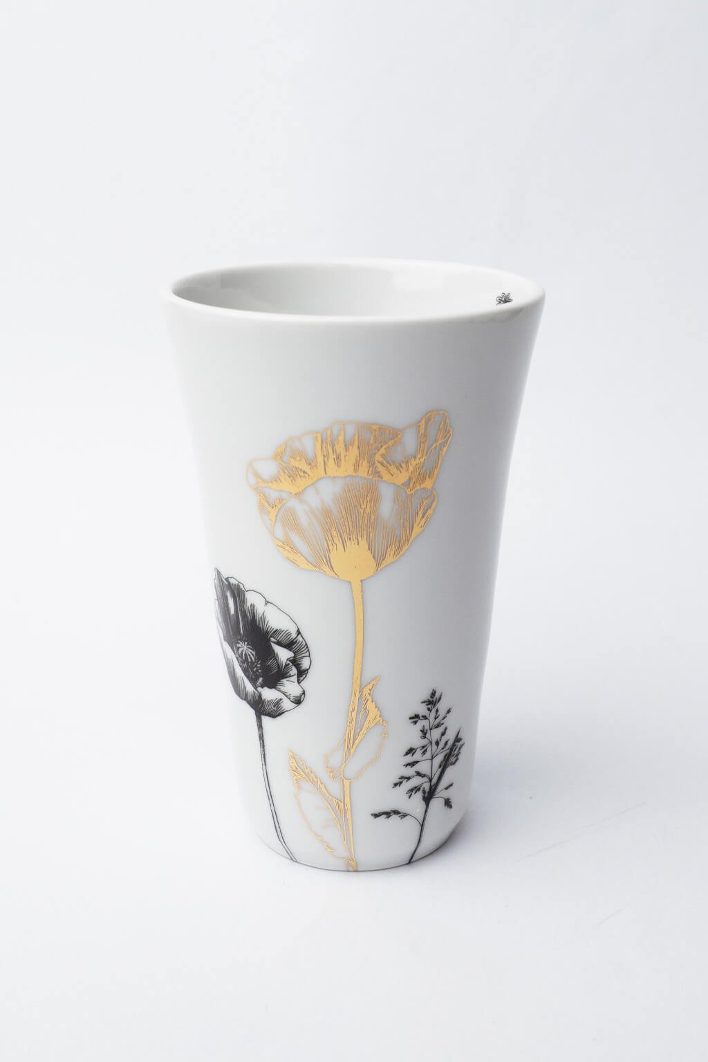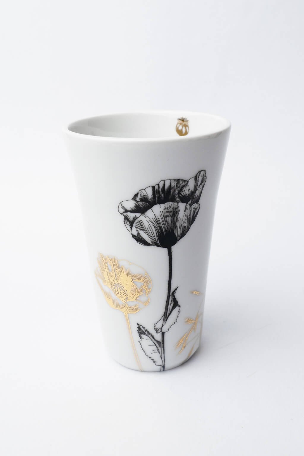 Porcelánový kalíšek na latte s motivem vlčího máku a zlatými detaily je elegantním doplňkem pro milovníky kávy a designu. Jeho sofistikovaný vzhled ocení ti, kteří hledají styl i funkčnost v každodenním rituálu. Ideální jako dárek pro ty, kdo mají smysl pro detail a kvalitu.