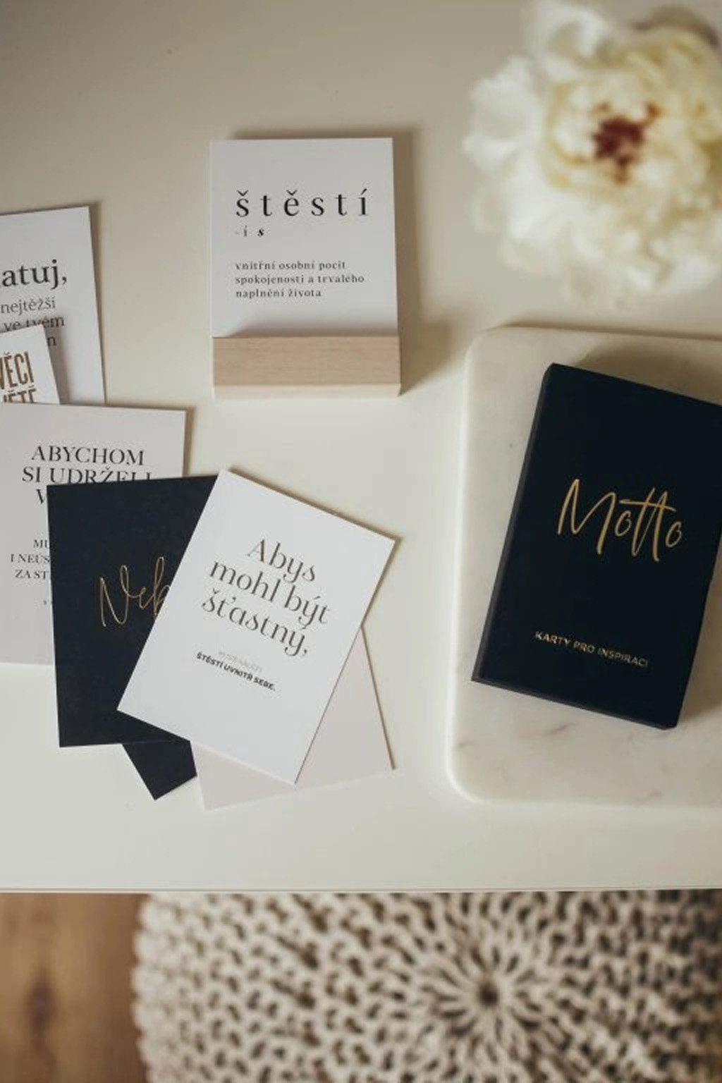 Sadu 17 motivačních karet zdobí čistý, typografický design a jednoduchost, kterou v Bloque. milují. S elegantním stojánkem v dřevěném provedení.