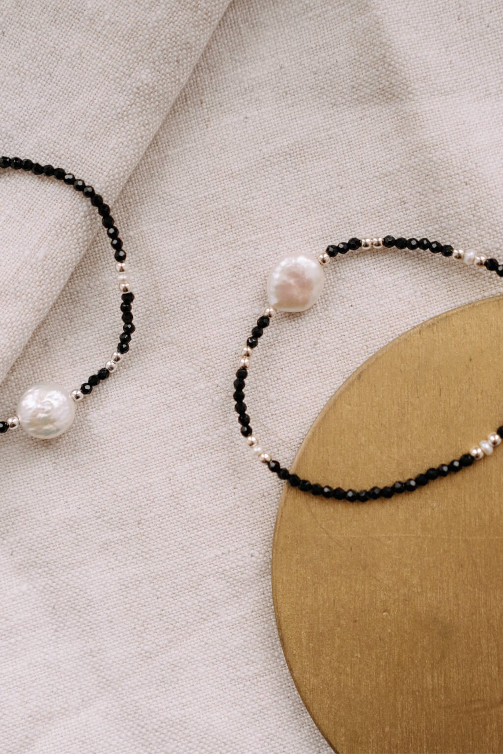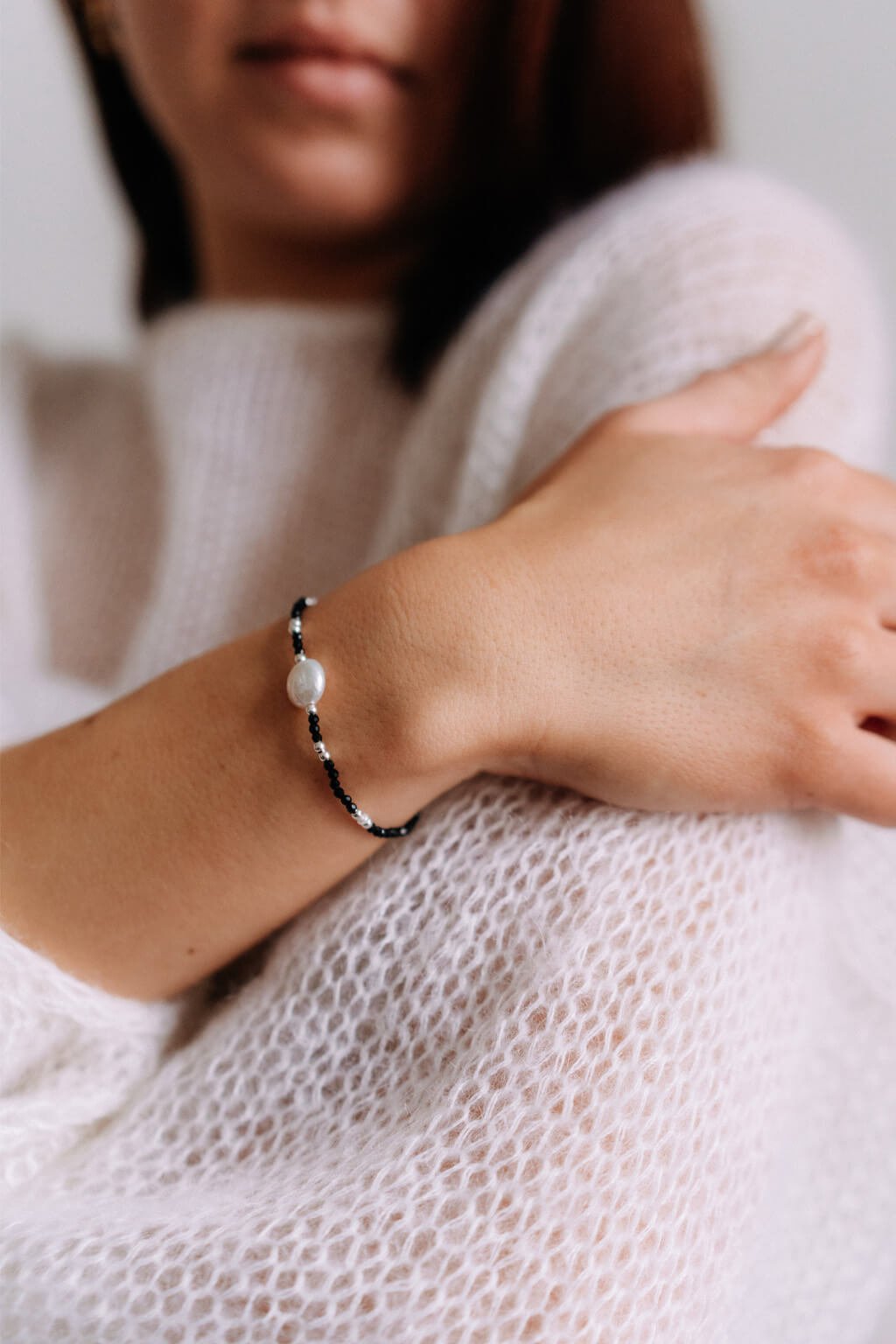 Náramek ze spinelu a říčních perel se stříbrnými komponenty vyniká svou elegantní černou barvou, která dodává šperku tajemný a sofistikovaný vzhled.