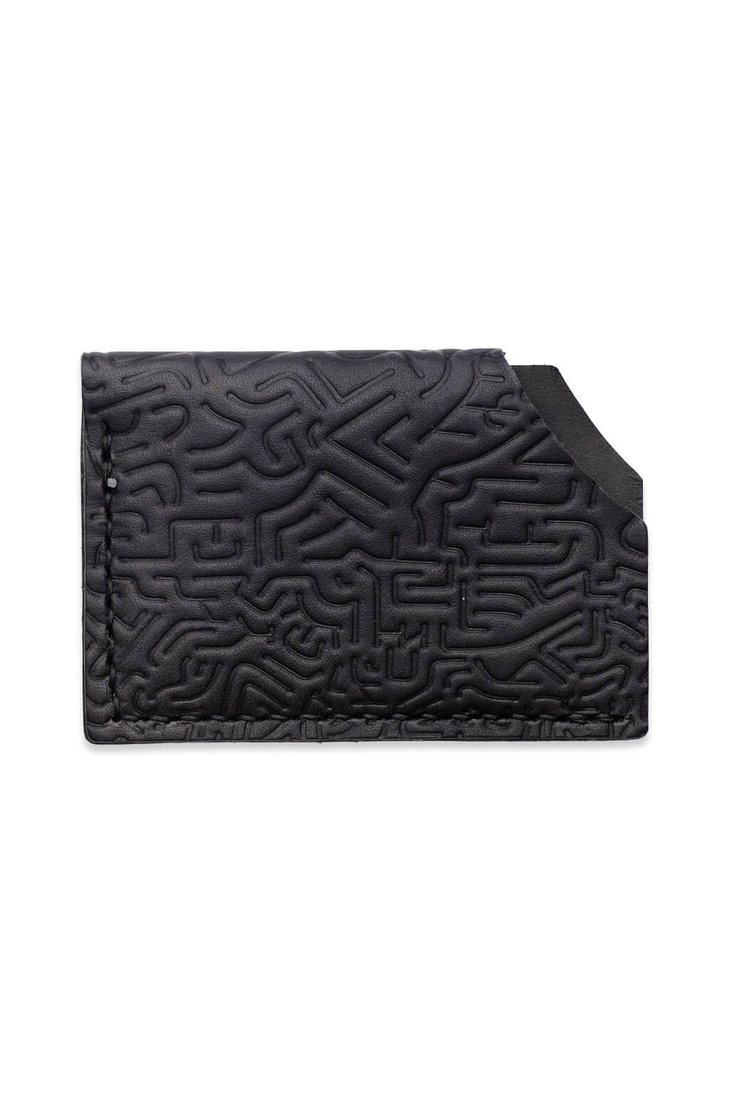 Kožené pouzdro na karty doplněné o autorskou ražbu inspirovanou přírodními tvary.