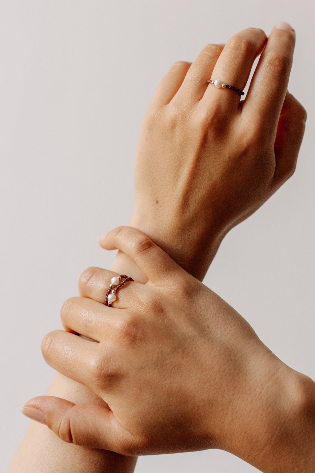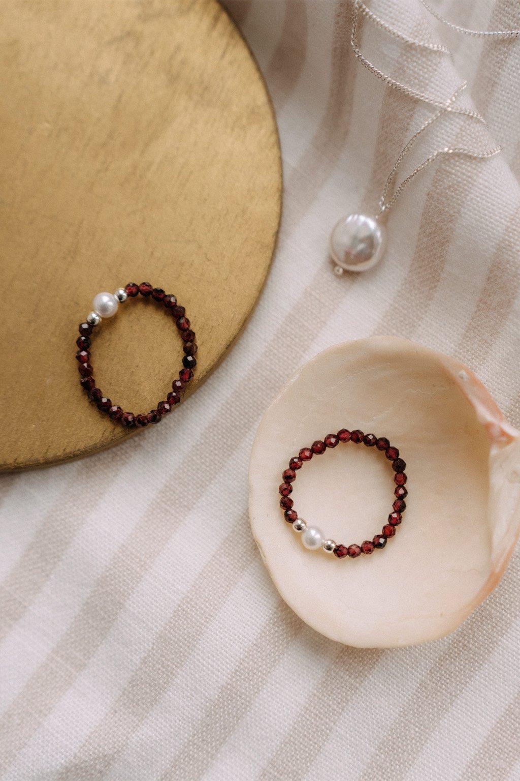 Prsten z granátu a perel se stříbrnými komponenty představuje harmonii romance a jemné elegance. Temná barva granátu v kombinaci s klasickými perlami vytváří nádhernou paletu barev, která oslní na první pohled a působí velmi sofistikovaně.