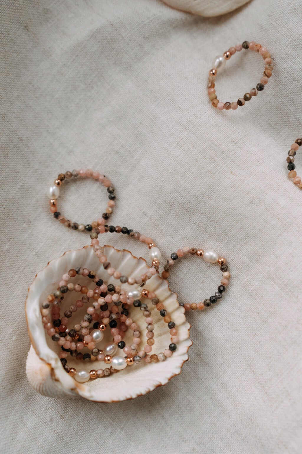 Prsten z granátu a perel s rosegold komponenty představuje harmonii romance a jemné elegance. Rodochrozit v kombinaci s klasickými perlami vytváří nádhernou paletu barev, která oslní na první pohled a působí velmi sofistikovaně.