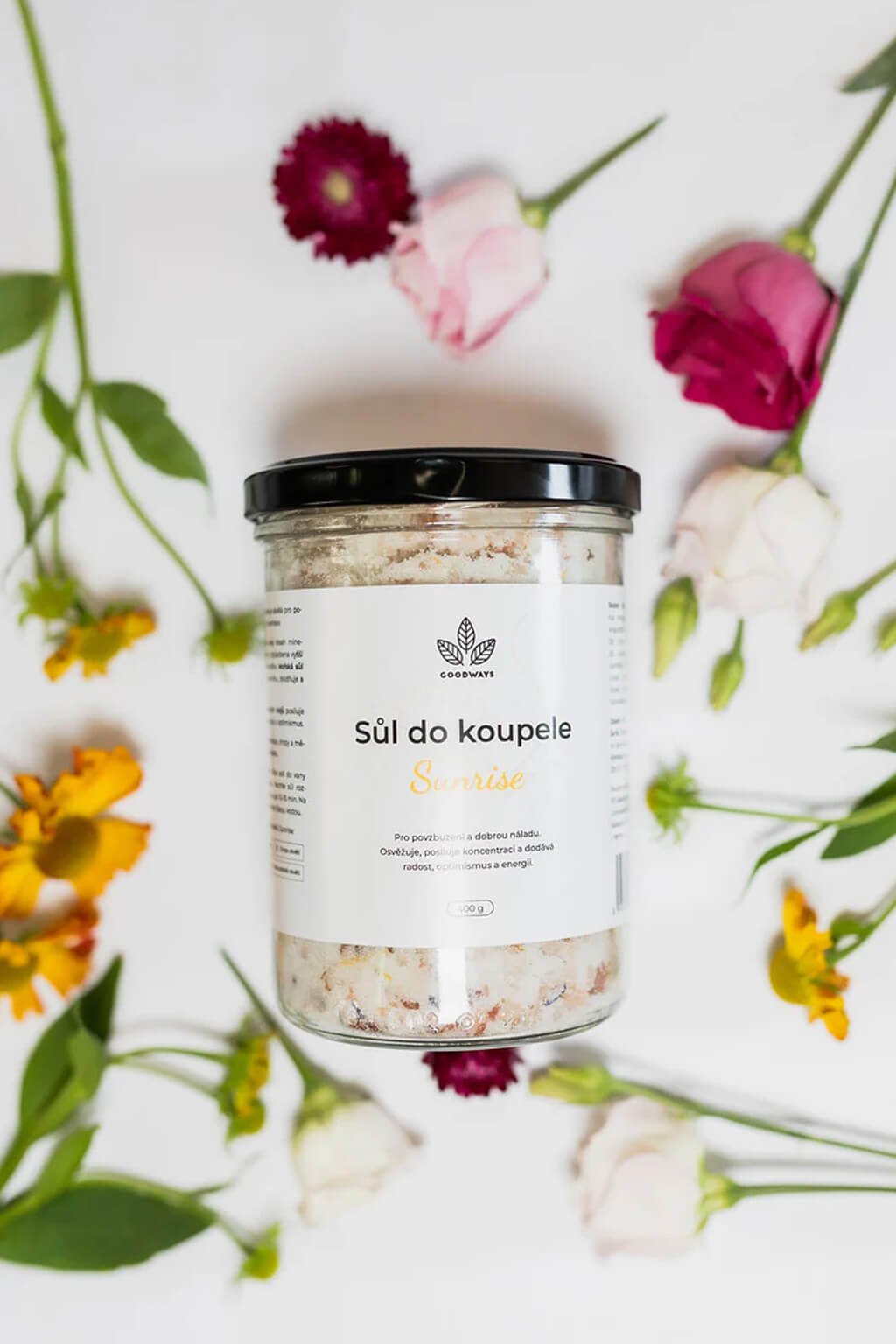 Sůl do koupele Sunrise je skvělá pro povzbuzení a posílení koncentrace. Himalájská sůl má vysoký obsah minerálů. Její růžová barva je způsobena vyšší koncentrací oxidu železitého. Mořská sůl má skvělé účinky na pokožku, zklidňuje a harmonizuje. Vyvážená směs éterických olejů posiluje koncentraci, dodává radost a optimismus. Sušené květy růže, levandule, chrpy a měsíčku podpoří dobrou náladu.