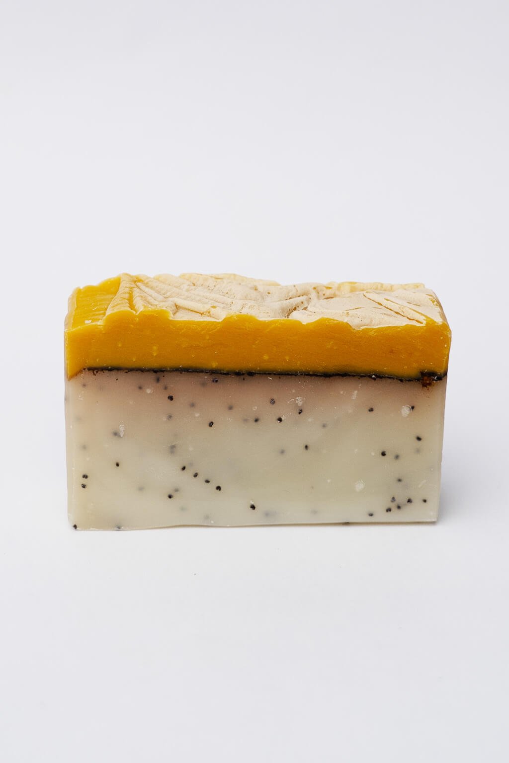 Kokosový tuk, Olivový olej, Esenciální oleje Citronová tráva a Citron, semínka máku, přírodní minerální oxid Ingredients: Sodium Cocoate, Sodium Olivate, Aqua, Cymbopogon Citratus Leaf Oil, Citrus Limon Fruit Oil, Papaver Somniferum Seed, *Citral, *Limonene (*přirozená součást esenciálních olejů) , CI 77492 (minerání oxid).