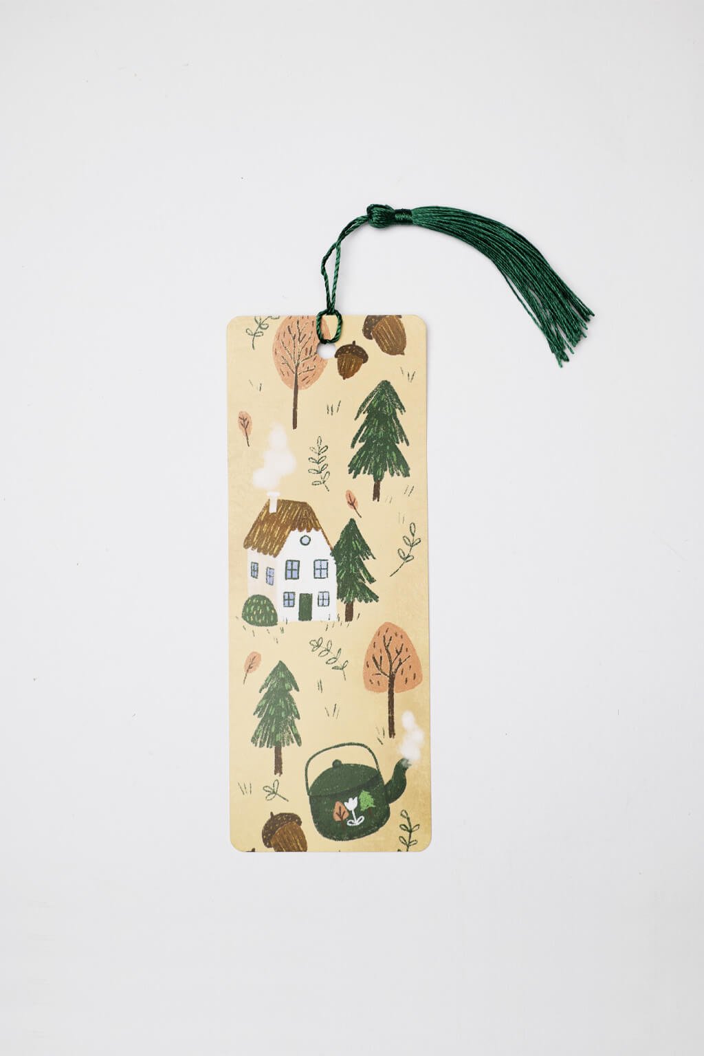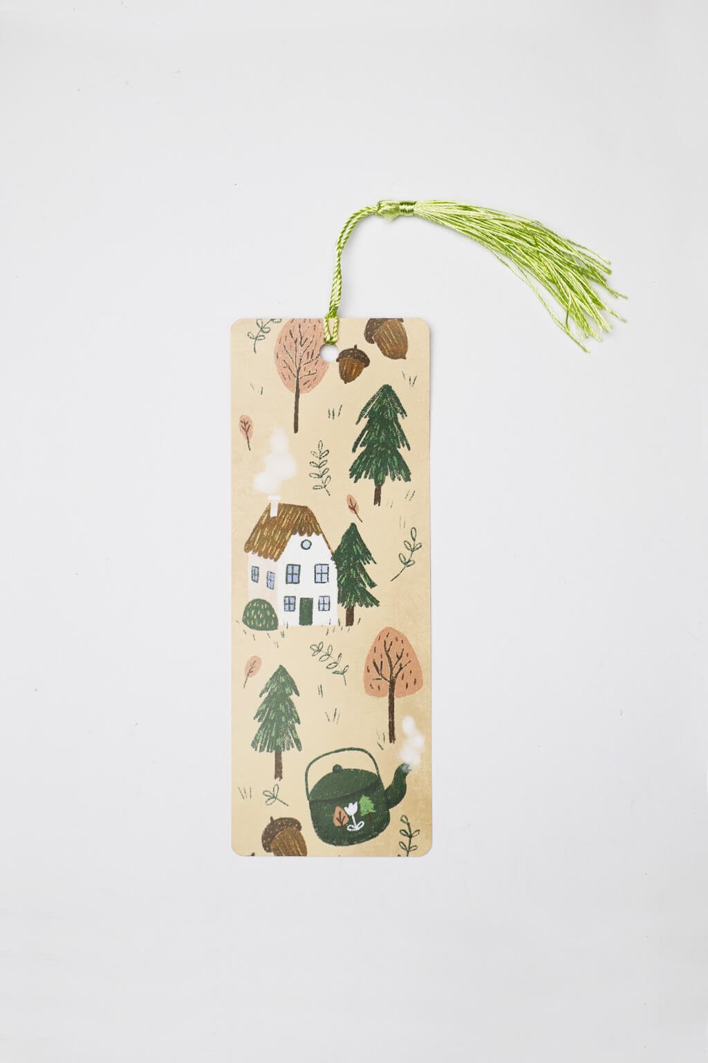 Tato papírová záložka s autorským motivem domečku, lesa a konvice čaje od Sandry Kocmanové evokuje pohodu a útulnost každého chvíle strávené s knihou.