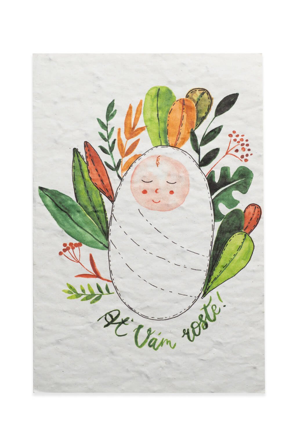 Živé přáníčko s motivem miminka a nápisem „Ať vám roste!“ přináší nejen krásné přání, ale i možnost vypěstovat si vlastní kousek přírody.